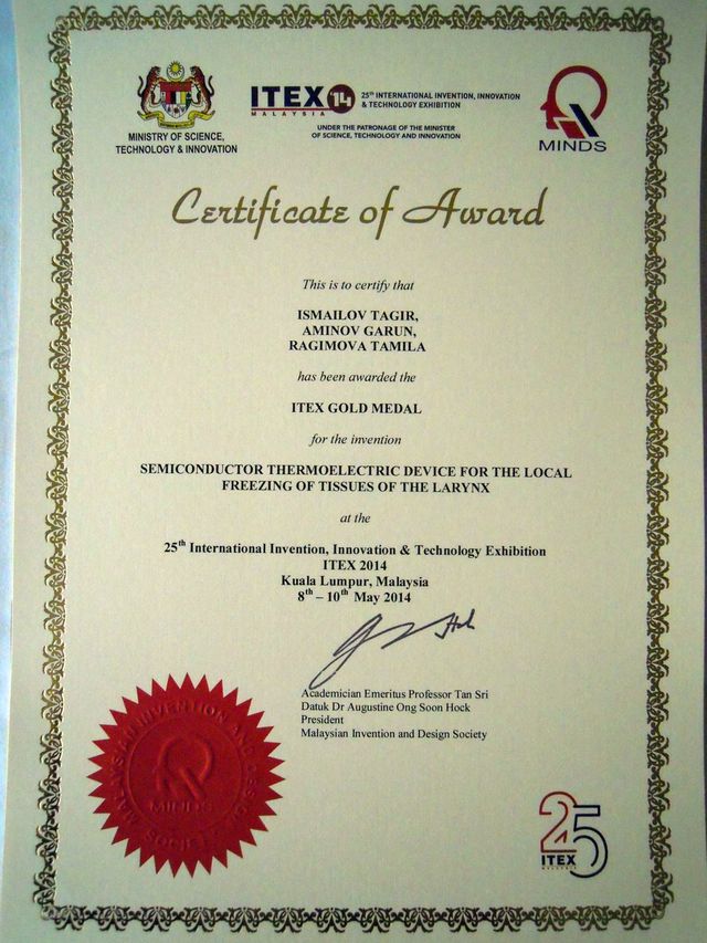 Победа завоевана на 25 Международной выставке инноваций и новых технологий ITEX’14, проходившей в Конгресс-центре Куала-Лумпура (KLCC) (Республика Малайзия).